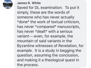 In a recent comment dealing with this post by Taylor DeSoto’s There is No Modern Doctrine of PreservationThere is No Modern Doctrine of Preservation James White has decided he’s going to “examine” Taylor’s post. Here’s the comment below: